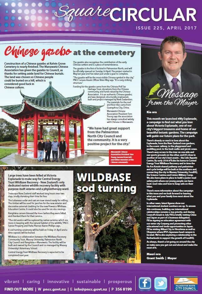 The Square Circular was Palmerston North City Council's monthly community publication, informing Palmerstonians of PNCC initiatives, activites, and events. This month's issue includes: Chinese gazebo at Kelvin Grove cemetery; Grant Smith; Anzac Day; Wildbase Recovery Centre; bees; notable trees; Arapuke Forest Park; Ashhurst Domain; Esplanade; abandoned vehicles; councillor contact details; council meetings.