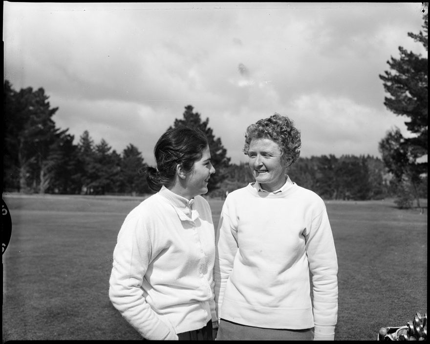 This image was taken for a story that ran in The Manawatu Evening Standard on 08 September 1960 "The New Zealand representative, Miss S. Chapman (Auckland), and Mrs. R. Laugesen (Wanganui) who contested the final this afternoon in the Manawatu women's open tournament."