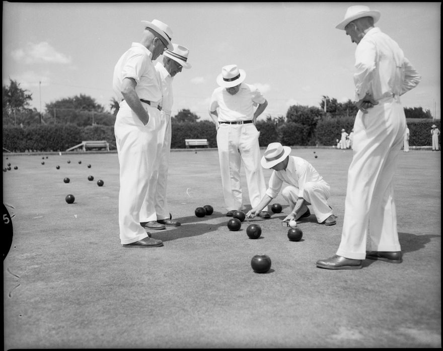 This image was taken for a story that ran in The Manawatu Evening Standard on 14 February 1958, page 3: "A typical sight at the veterans' bowling tournament, held yesterday at the Northern Club's green, is this interest shown in a close measure. A friendly atmosphere prevailed throughout the tournament."
