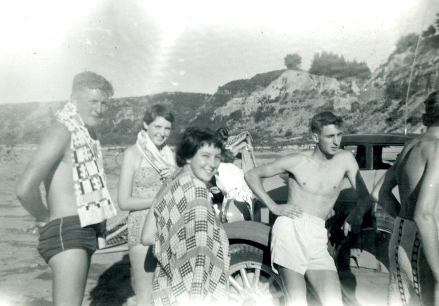 A groups of friends on a swimming excursion to the Manawatu River, accessed at the end of Albert Street, Palmerston North. From left: Tom Bainbridge; Margaret Greatorex (later Hansen); Patricia Hayes (later Eaton); Pete Hansen; Ross Greatorex.