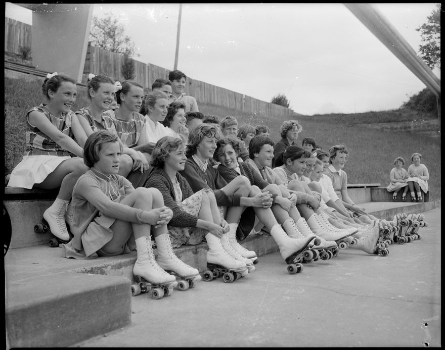 This image was taken for a story that ran in The Manawatu Evening Standard on 19 November 1960 "Contestants in the Palmerston North Amateur Roller Skating Club's sixth annual championships taking place at the Memorial Park skating rink today and tonight were photographed while awaiting their turn to compete in the compulsory figure section."