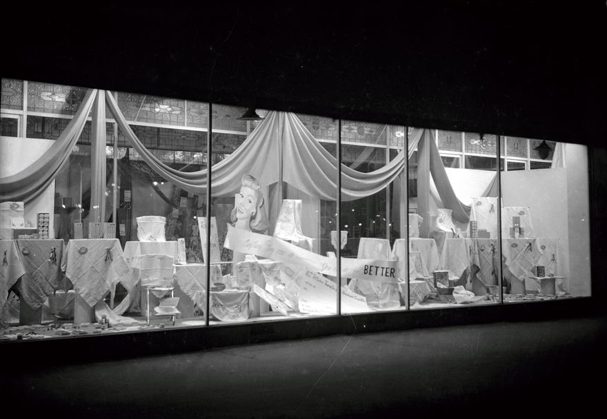 This display window of Collinson and Son Ltd. shows a selection of table linen available for sale. The 1946 telephone directory lists their address as "Broadway & Kingsway".