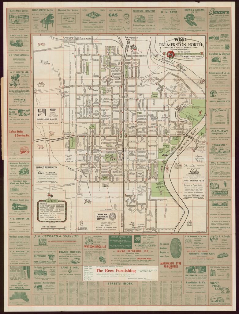Public amenities and businesses mentioned include: Madge Motor Service, Piano Service Co. Ltd., Municipal Bus Services, HUMES (Hume Industries NZ Ltd.), GAS (Palmerston North City Gas Dept.), Furniture Removals – Barton Ginger & Co. (N.Z.) Ltd., D.N. Davis, Agnew’s, Crozier Motors, Crawford & Clayton Ltd., Richard Moon & Co. Ltd., Hales Walker Ltd., W.H. Forero, Clapham’s, Pegdon’s, Brill & Morgan, Formica Specialists, Fibrolacq, Manawatu Joinery Co., G.H. Bennett & Co. Ltd., Grundy’s Rental Cars, Lien Shailer, Snappy Parcel & Carrying Co. Ltd., J.B. Gerrard & Sons Ltd., Watson Bros Ltd., Jamieson Services Ltd., W. Knight & Son Ltd., Micro Recording Ltd., Manawatu Tyre Re-Builders, Lane & Hill, Fraser Motors, Wrigley’s Motor Services, K.P. Wilson Ltd., Jemmott’s Novelty Plants, The Rees Furnishing, Child Bros Ltd., H.E. Townshend Ltd., A.R. Martin Ltd., Cement Products Ltd., Manawatu Panel Beaters, Safety Brakes & Steering Ltd., Harold Pierard Ltd., Terrace End Wood & Coal Depot, Newmans Coach Lines, G.F. Everson Ltd., Memorial Park, Victoria Esplanade, Awapuni Racecourse, Riverbank Reserve, Milson Park, Railway Station, Showgrounds, Municipal Abattoir, Municipal Gas Works, Hospital Grounds.