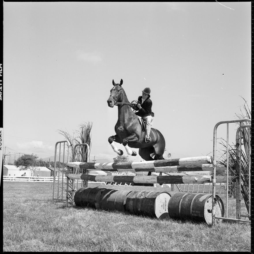 [Image of a horse jumping a fence, possibly at the Horowhenua A,. P. and I. Show.]