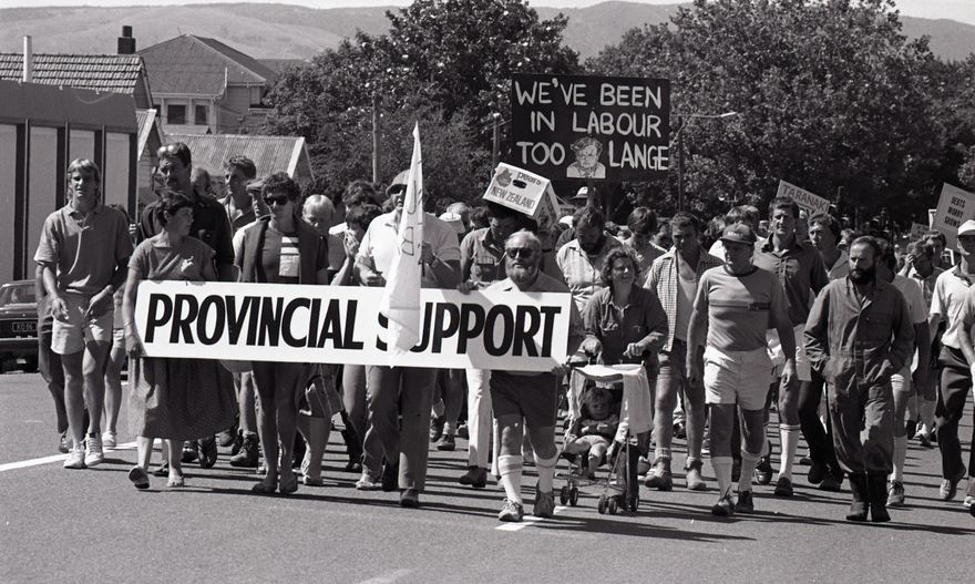 This series of images was taken for a story that ran in on the front page of The Manawatu Evening Standard on 10 February, 1987. The story pertains to the mortgagee auction of a farm owned by Paul Geurtjens of Bulls. Up to 700 protesters attended the auction at Harcourts real estate on Fitzherbert Avenue. Auction proceedings were interrupted by protesters placing false bids and drowning out proceedings. The property was not sold as it didn’t raise a bid. The images of Longburn workers protesting appear on the same roll of film, however it is unclear if theese are from the same event.