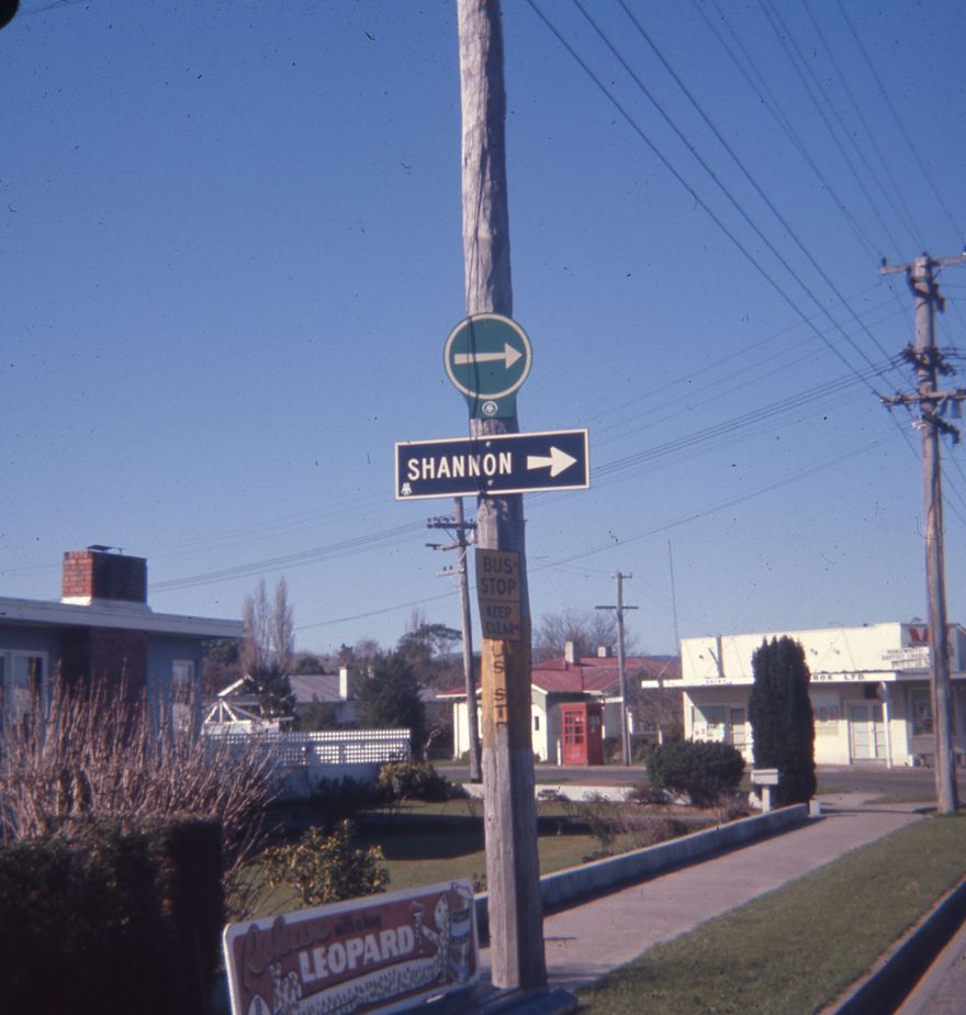 Cnr. Pahiatua and Albert Streets, picture taken from Albert Street looking at the corner of Pahiatua Street. There is a bus stop just back from the corner and a dairy on the corner. The sign pointing to Shannon takes you up Te Awe Awe Street to Fitzherbert Avenue, which gives access to the State Highway.