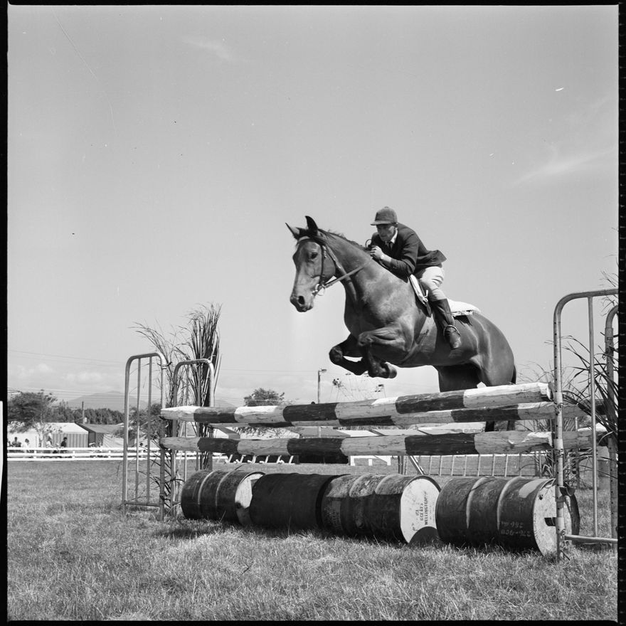 [Image of a horse jumping a fence, possibly at the Horowhenua A,. P. and I. Show.]