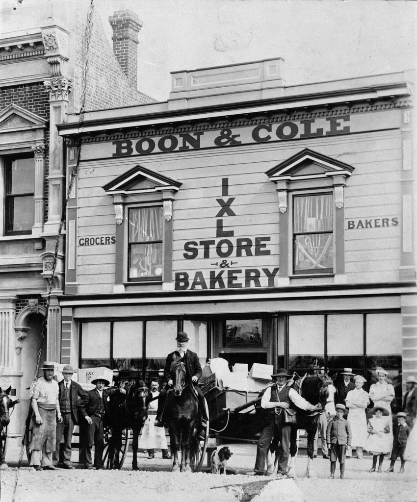 This store and bakery which used the trade name ‘IXL’ was situated in The Square, between Rangitikei Street and Coleman Place. The man on horseback in the centre of the photograph is Mr James Carroll, owner of the Clarendon Hotel on the corner of Rangitikei Street and The Square. The gentleman far left wearing an apron is Mr William Thomas Wood, a blacksmith who had premises on the corner of Cuba and Rangitikei Streets, who later became Mayor, 1895-1899 and 1901-1903, and Member of Parliament for Palmerston North 1902-1908.