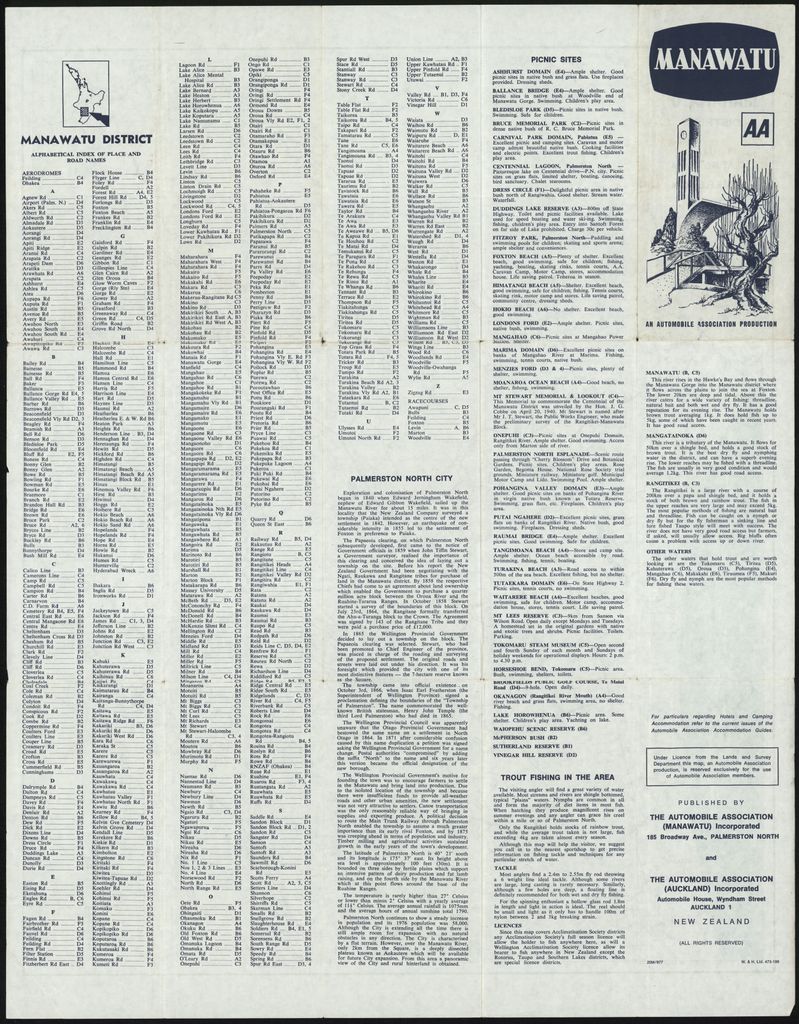 - This map details the major driving routes in and around the Manawatu District as in the 1970s. The reverse gives a potted history of Palmerston North and lists some of of the regions most popular features, including parks, beaches and other amenities.