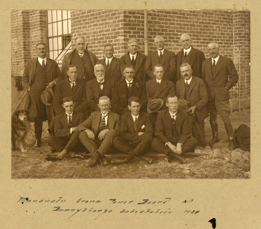 This photograph shows sixteen (16)members of the Power Board, and canine friend posing outside the Bunnythorpe Substation.