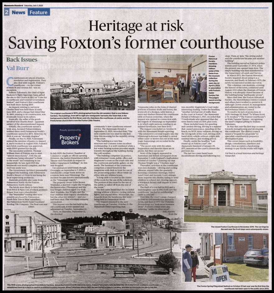 Local historians weekly "Back Issues" article in the Manawatū Standard. History of Foxton's former courthouse building, corner of Main Street and Avenue Road. In 1863 Ihākara Tukumaru, chief of Ngāti Raukawa's Ngāti Ngarongo hapu, gifted the site to the Crown, as "a site for a courthouse and General Government Station". Foxton's first courthouse was built there in 1869. Its replacement opened on the same site in September 1929 and served as a courthouse until January 1971. The building was then used as Foxton's police station until 1974. Thereafter it became a volunteer run museum.