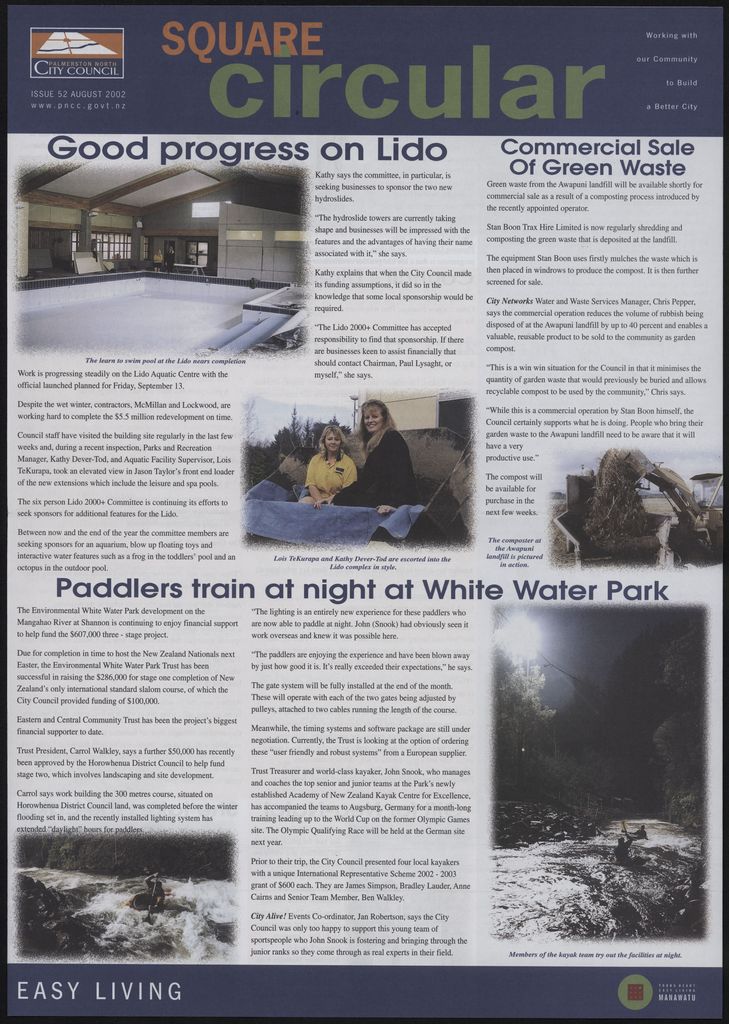 The Square Circular was Palmerston North City Council's monthly community publication, informing Palmerstonians of PNCC initiatives, activites, and events. This month's issue includes: The Square; Regent theatre; Lido; Destination Manawatu; White Water Park; Awapuni landfill; composting; Arena Board; community employment initiatives fund; website; by-election; ward committees; masters games; Destination Manawatu; Relay for Life; ideal homes exhibition; road safety education; strategic plan; long term financial plan; annual plan; Whakarongo hall; Missoula sister city; neo natal unit; Oline Ball; 125th celebrations; Fitzherbert bridge; Ian Matheson book.