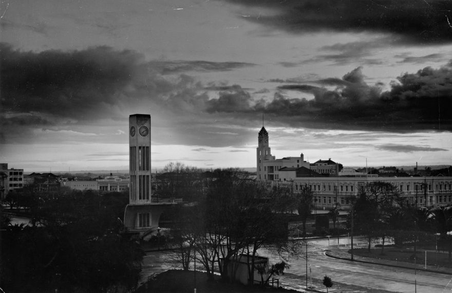 The Clock Tower in Palmerston North was constructed in 1957 to house the clock removed from the Post Office in 1942, when the tower was removed as an earthquake risk. On the left can be seen the Post office, and beyond, on the skyline, the Australasian Temperance and General Mutual Life Assurance Society Ltd (T&G) building in Broadway.