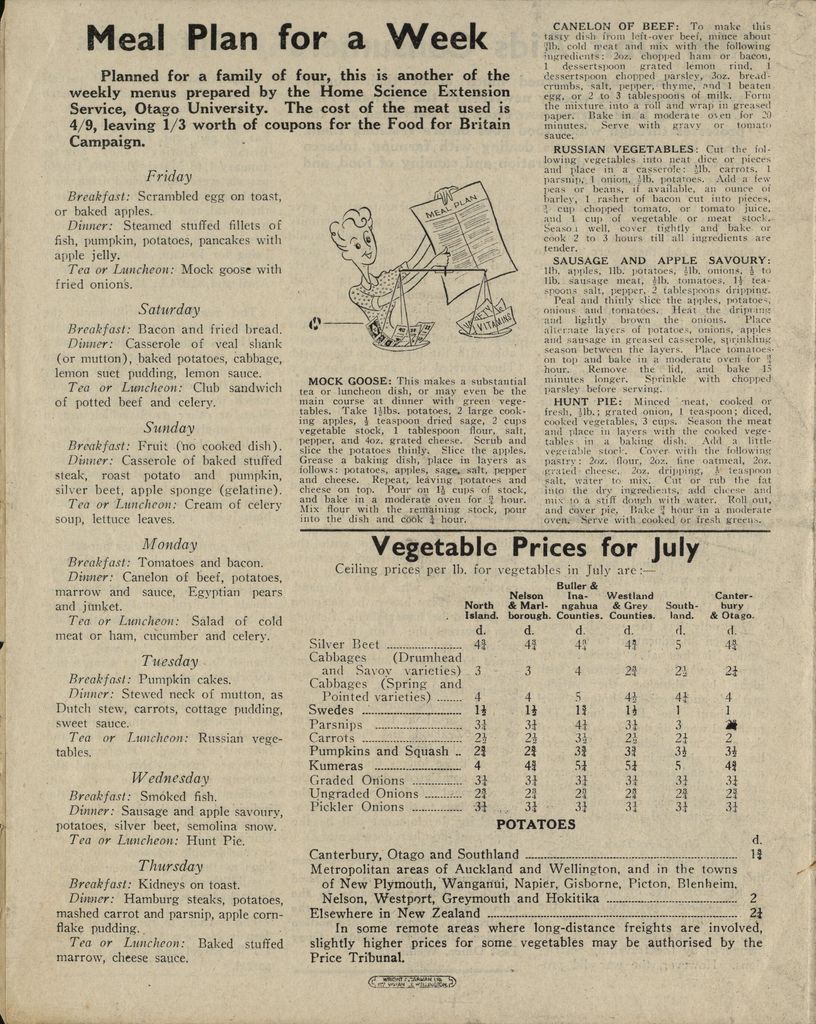 Weekly menu prepared by the Home Science Extension Service, Otago University