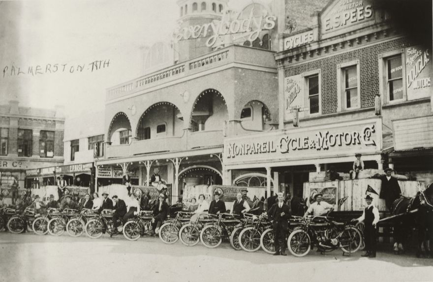 The Nonpareil Cycle and Motor Company was originally established in Ghuznee Street, Wellington. In November 1906 this company bought out the Palmerston North firm of Clarkson and Co. in order to establish its headquarters in Palmerston North. Messrs Eric Stanley & Charles Sydney Pees, proprietors, had a 2000 square foot show room outfitted on The Square. They went on to employ a staff of 25 people trading extensively through the North Island, with agencies in Foxton, Otaki and Shannon. They were agents for Premier and Centaur cycles, as well as promoting their own brand of cycle the 'Nonpareil'. To the right can be seen the Everybody's Theatre, later the Midland Hotel. Ernie Hind is 6th from left and Percy Coleman is 7th from left.