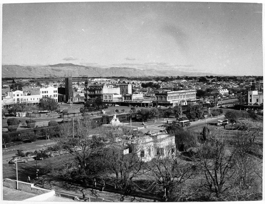 This photograph was taken from the tower of the Australasian Temperance and General Mutual Life Assurance Society Ltd (T&G) building, near the corner of Broadway Avenue and The Square. This partial view of the Square shows a number of its most recognisable monuments including: the Ladies Rest Rooms, built 1936; War Memorial, unveiled in 1926 to commemorate the casualties of WWI; the second band rotunda, built in 1907, but pulled down in 1956 to make way for the Hopwood Tower; All Saints Church, built 1914. Beyond can be seen the Tararua Mountains. Note that a long train is running through the Main Street line.
