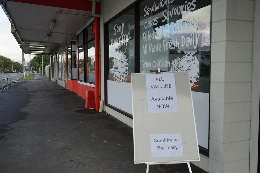 A sign advertising the availability of the flu vaccine from the Grant Irvine Pharmacy during the COVID-19 pandemic.