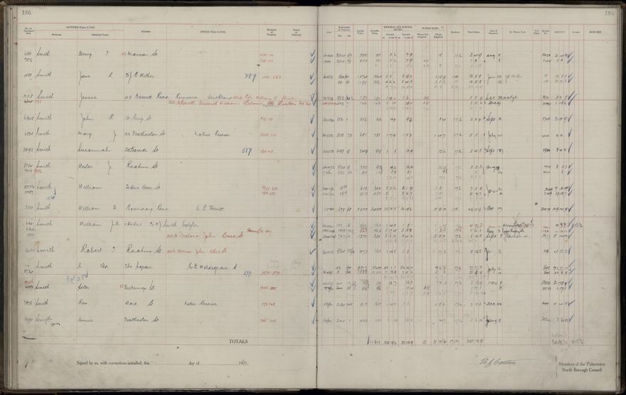 Palmerston North Borough Council rate book, listing rate payers for the years (1 April - 31 March) 1921 - 1922. Gives names, street, owner (if different to rate payer), legal description of property, capital and unimproved values and rates paid.