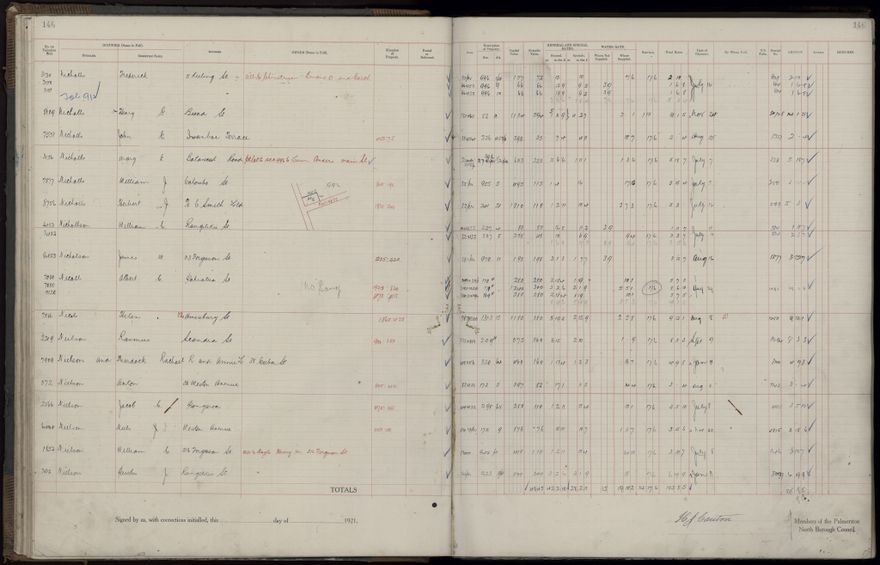 Palmerston North Borough Council rate book, listing rate payers for the years (1 April - 31 March) 1921 - 1922. Gives names, street, owner (if different to rate payer), legal description of property, capital and unimproved values and rates paid.