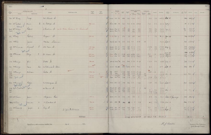 Palmerston North Borough Council rate book, listing rate payers for the years (1 April - 31 March) 1921 - 1922. Gives names, street, owner (if different to rate payer), legal description of property, capital and unimproved values and rates paid.