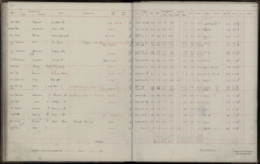 Palmerston North Borough Council rate book, listing rate payers for the years (1 April - 31 March) 1921 - 1922. Gives names, street, owner (if different to rate payer), legal description of property, capital and unimproved values and rates paid.