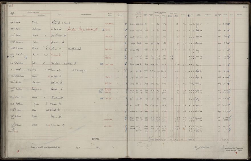 Palmerston North Borough Council rate book, listing rate payers for the years (1 April - 31 March) 1921 - 1922. Gives names, street, owner (if different to rate payer), legal description of property, capital and unimproved values and rates paid.