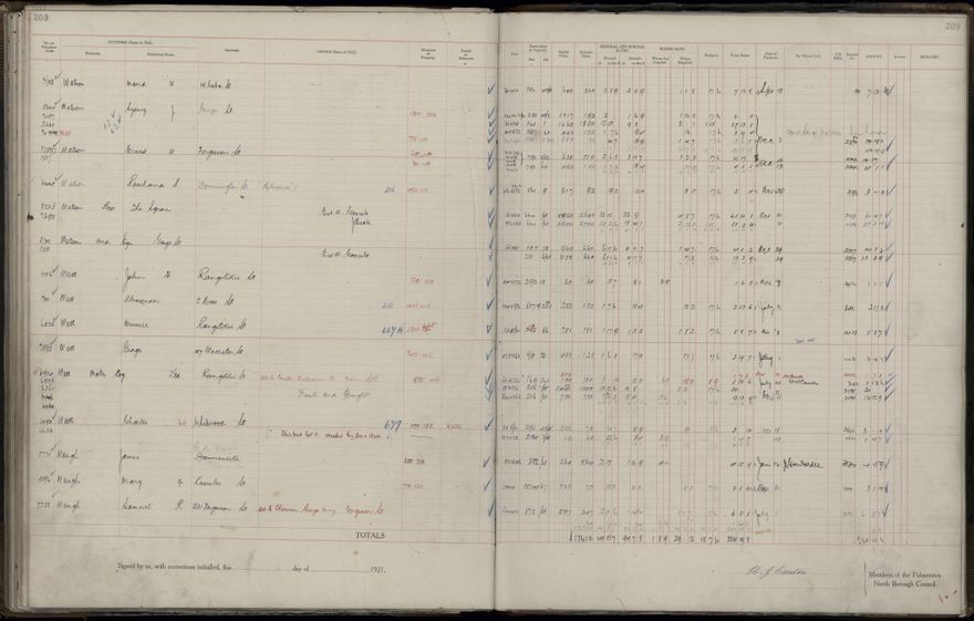 Palmerston North Borough Council rate book, listing rate payers for the years (1 April - 31 March) 1921 - 1922. Gives names, street, owner (if different to rate payer), legal description of property, capital and unimproved values and rates paid.