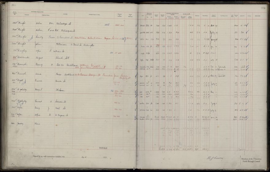 Palmerston North Borough Council rate book, listing rate payers for the years (1 April - 31 March) 1921 - 1922. Gives names, street, owner (if different to rate payer), legal description of property, capital and unimproved values and rates paid.