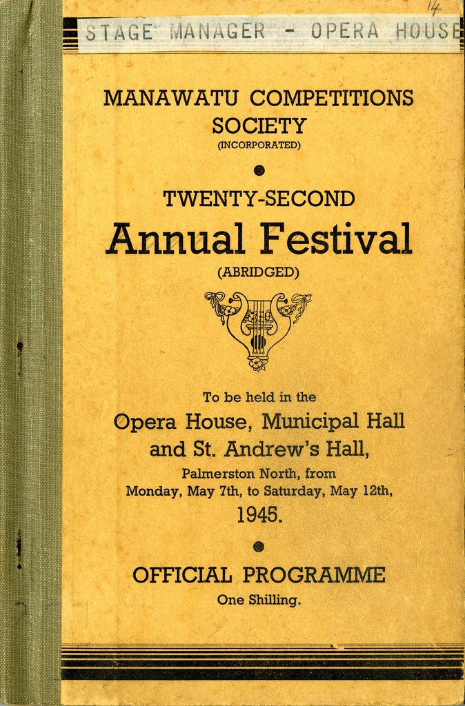 This is the programme for the Twenty-Second Annual Festival of the Manawatū Competitions Society, which was held in the Opera House, Municipal Hall and St. Andrew's Hall between 7 May and 12 May 1945. The competition categories included elocution (speech and drama), dance and music (both vocal and instrumental). Most entrants were children or young people. The programme belonged to the Stage Manager and has additional pages bound in, which are annotated with notes about the competitions.