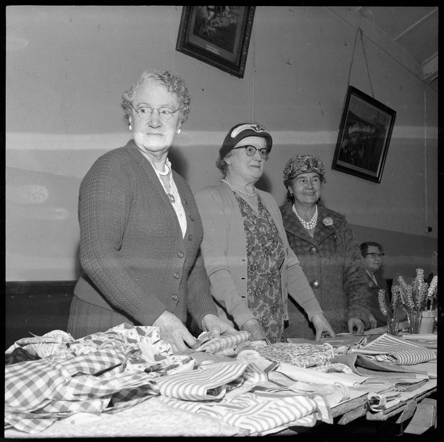 This image was taken for a story that ran in The Manawatu Evening Standard on 21 September 1960 "Yesterday afternoon the Happiness Club held its annual bazaar in aid of the club funds. Above is a group of the many stallholders. They are Mrs. Aubrey, Mrs Barlow (vice-president), and Mrs Johnston (president)."