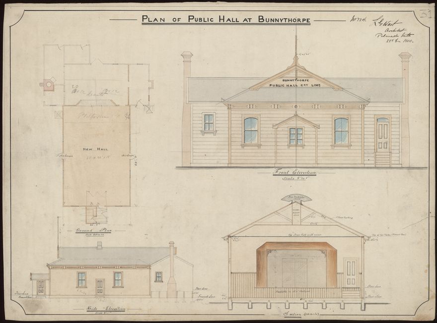 This plan for the Bunnythorpe Public Hall was designed by Ludolph Georg West (1846-1919). The Danish-born architect established an architectural practice in Palmerston North in about 1880. In 1912 he formed a partnership with is son, Ernest Vilhem West, who continued the business after his father's death.