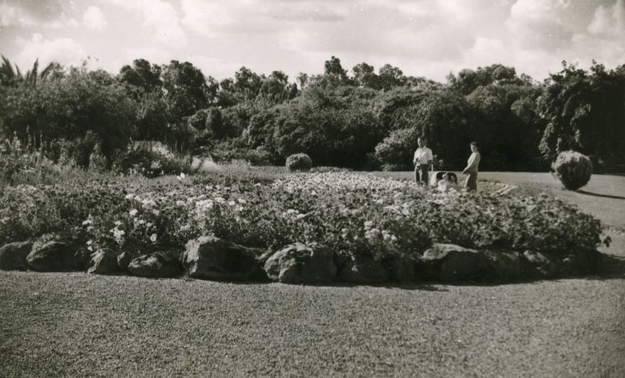 A young couple and their baby stop to admire a fine planting of flowers in the Victoria Esplanade.