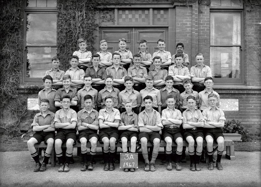 The boys from Form 3A in 1947 pose for their photograph. According to the school year book for 1947, the boys in this form are: J Acheson, P Allan, P Baillie, J Barrett, R Berkahn, M Brogden, J Cooper, R Croucher, M Dean, P Doak, B Eagle, A Francis, J Furneaux, W Gaudin, R Gee, J Hanley, A Hastie, B Kerr, W Larcomb, I Mcleod, G Mcpherson, F Maultsaid, J Milne, G Morine, K Patel, E Paterson, L Port, R Randell, W Reddington, D Sayers, I Scott, N Smith, R Thomas, D Ward, E Williams, J Wilson. As only 32 boys are present in the picture, presumably some boys were absent on picture day.