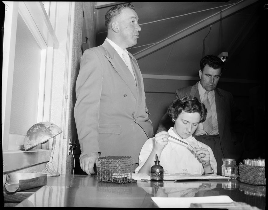 - This image was taken for a story that ran in The Manawatu Evening Standard on 14 March 1958, page 4: "Intent on her task of conducting a test for true type in white clover, Mrs. J. Reid, a technical assistant at the Seed Testing Station, fails to notice the interest in her work taken by Cr. H. Bodell (right) as he listens to an explanation given by Mr. A.V. Lithgow, the officer in charge of the station."