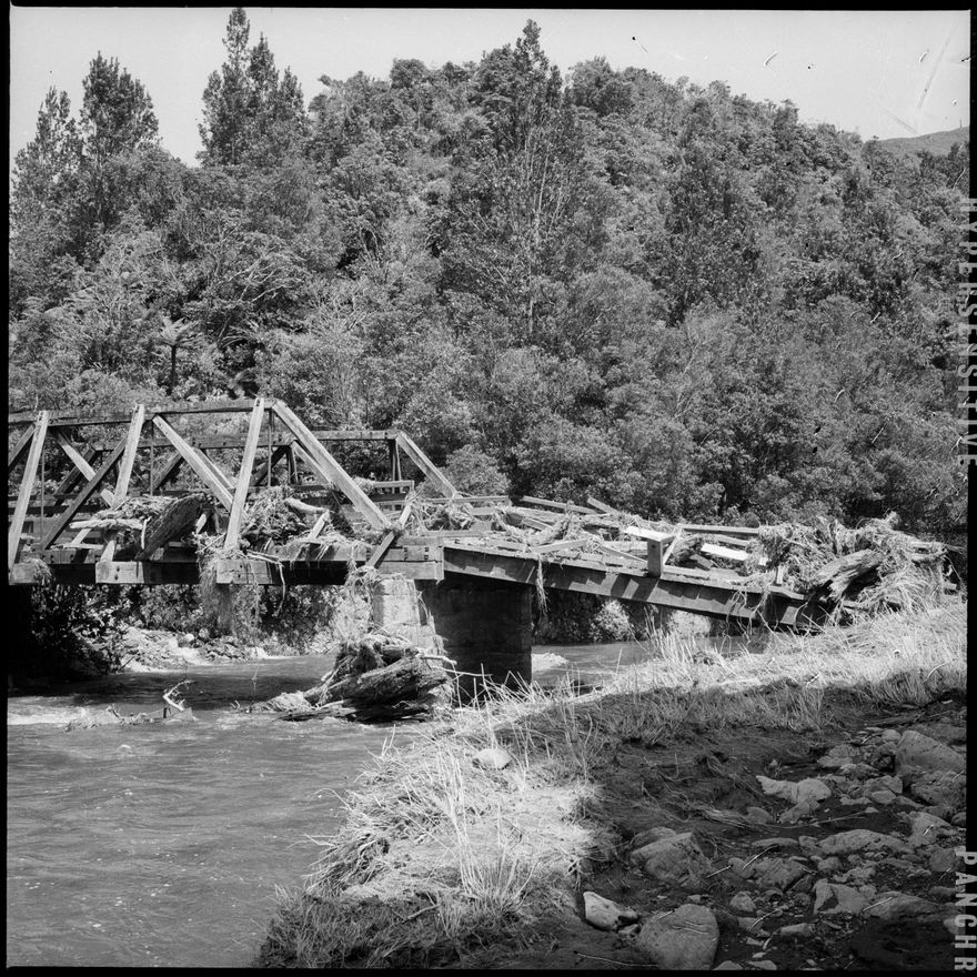 This image was not published in The Manawatu Evening Standard, taken on 9 January, 1964. "This tangled mess of debris and wood is Black's Bridge on the Kahuterawa Road, spanning the stream of the same name. A complete section of the bridge collapsed into the stream when floodwater washed a pile away during Wednesday's rain. The water rose 11ft. in an hour, damaging the culverts and washing away parts of the road." Another image of the bridge was published on 11 January, 1964.