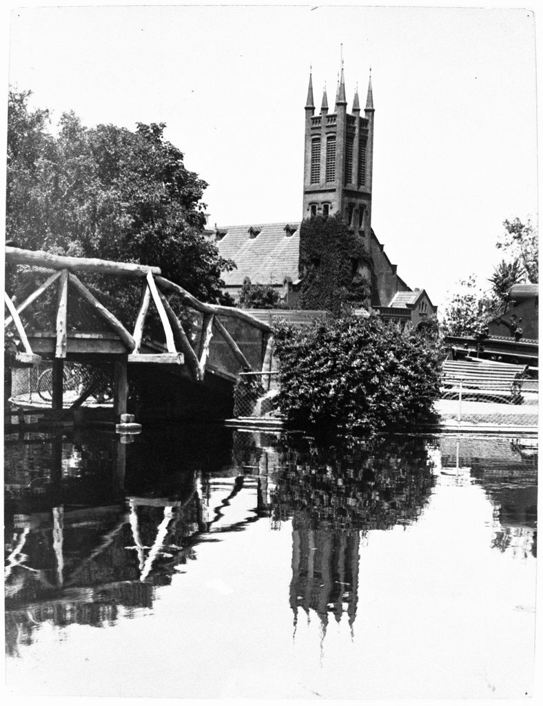 This photograph looks across the lakelet to All Saints Church, which was built in 1914-1915. The body of water visible in the foreground is the Butterfly Lakelet, which was constructed in October 1909. It was the main feature of the last quadrant of The Square to be developed by the then Beautifying Society. It is shaped as a butterfly, with the wings being bisected by a bridge as its body. The cannon (partially visible on right) was one of two installed in The Square in 1909. The guns were originally purchased by the Government in 1879 and installed at Fort Ngahauranga overlooking Port Nicholson, Wellington Harbour. They never fired a shot and were obsolete by 1900, when two were acquired by the Palmerston North Borough Council for display in the Square. By 1939, the Council decided the cannons had outlived their usefulness and sold them to a scrap dealer.