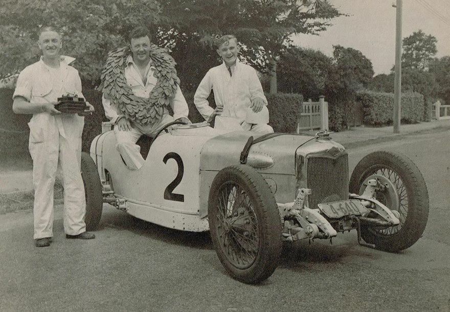 Photograph of the winning car, a Brooklands Riley, after the 1949 Wigram race win. Driver Morrie Proctor is sitting in the car, with his mechanic on the left. In 1951 Morrie Proctor came third in the second annual Ohakea Trophy driving a Riley 9 Special/Riley 1087cc 4cylinder car.