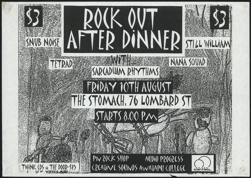 Rock out after dinner. $3. With Snub Noise, Just William, Tetrad, Sarcadium Rhythms. Friday 10th August. The Stomach, 76 Lombard St. Starts 8.00 pm. Twink CDs @ The door - $15. PN Rock shop. Audio progress Creative sounds Awatapu College.