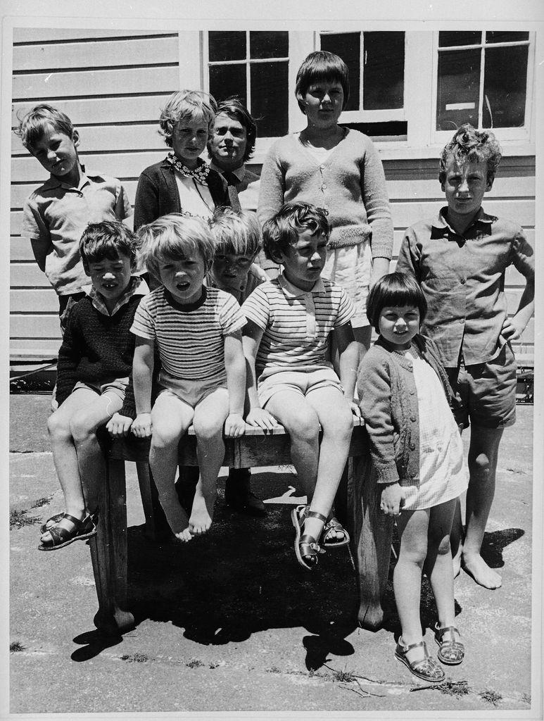 This photograph shows the entire class of Awahou South School with their Headmaster Mr P J Patten. Awahou South School was a one-room country school in the Pohangina Valley, Manawatu opened in 1902. The school building was moved to the Manawatu Museum following the School's closure in 1972.