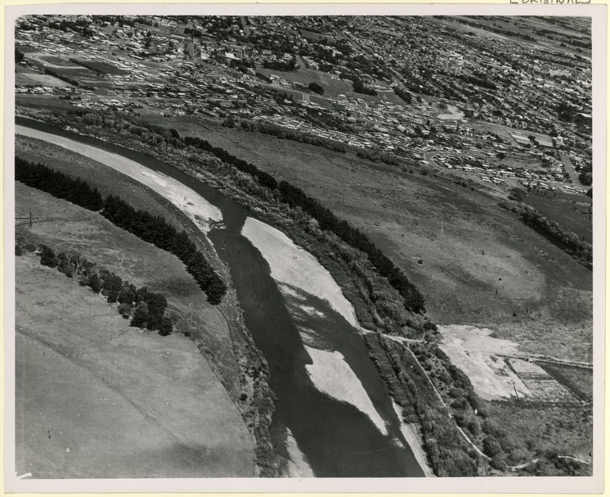 This photograph shows the site of the Palmerston North Golf Club before it was developed. Fitzroy Street runs in form near the mid-point of the right side with East Street running off it, almost parallel to the right edge of the photograph. Ruahine Street runs across the photograph from the left side, just above the river, to the right side, across the top of East Street.
