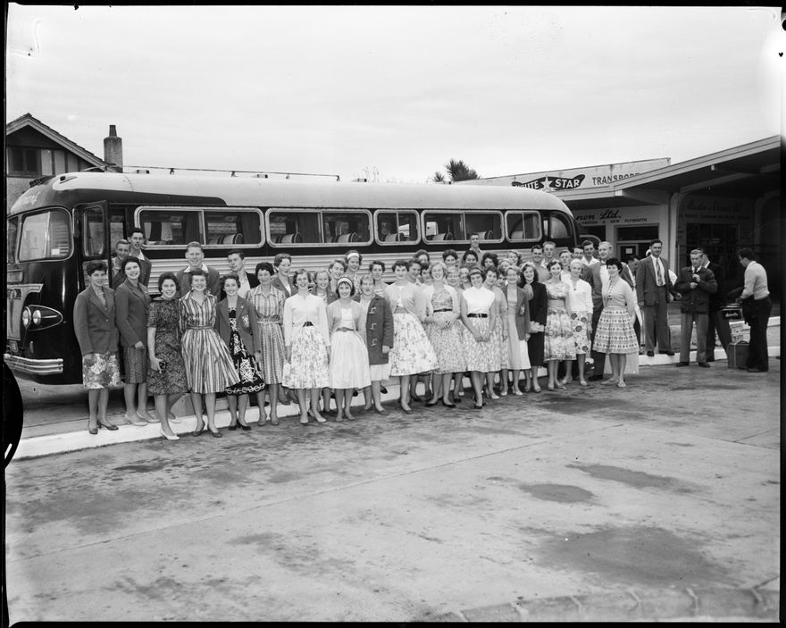 This image was taken for a story that ran in The Manawatu Evening Standard on 20 February, 1959. "These happy young men and women are students at the Palmerston North Teachers' College about to leave this morning for Curious Cove, where they will study art and Nature. Other students are going on various excursions during activity week, which began at the college today."