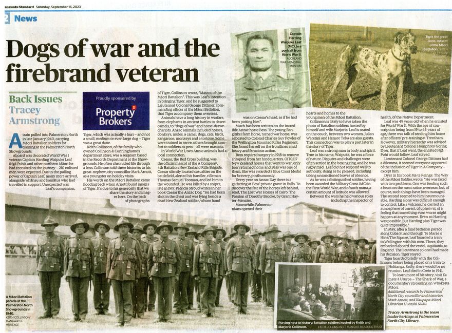 Local historians weekly "Back Issues" article in the Manawatū Standard. The story of the dog Tiger, a great dane, mascot of the Māori Battalion during World War 2. Tiger was the companion dog of Captain Harding Waipuke Leaf (Ngā Puhi). Tiger stayed in New Zealand when Captain Leaf departed for service overseas. Sadly he died in Crete in 1941.