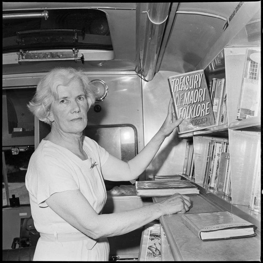 [Image of Librarian holding a copy of Treasury of Maori folklore / A.W. Reed, in a National Library book Mobile.]