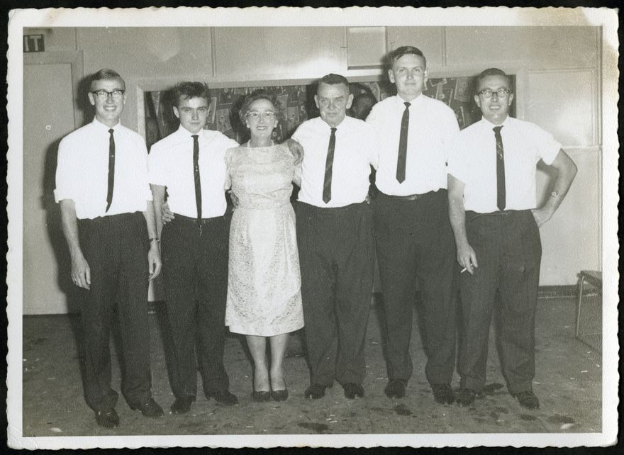 Wayne Evans’ 21st birthday clebration at the Railway Hall, Palmerston North. From left: Tony, Wayne, Betty and John (Jack) Evans, Mick and John Evans. Jack and Betty married in 1936 and had a family of four boys. They were early and long term residents of the Savage Crescent state housing precinct, living at 5 Mansford Place.