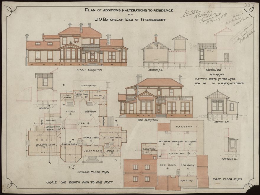 This plan for substantial modifications to a two-storey house was designed by L. G. West for J. O. Batchelar. The Danish-born architect Ludolph Georg West (1846-1919) established an architectural practice in Palmerston North in about 1880. In 1912 he formed a partnership with his son, Ernest Vilhem West, who continued the business after his father's death.