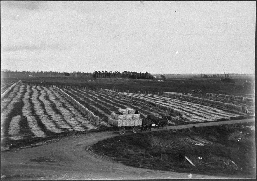 The Miranui Flaxmill was the largest flaxmill built in New Zealand, in 1907. Flax fibre is bleaching in the paddocks, while bales of hemp are being transported by horse and cart to Shannon where it would be transported by rail to Wellington. the contractor driving the cart was Vic Tippler.