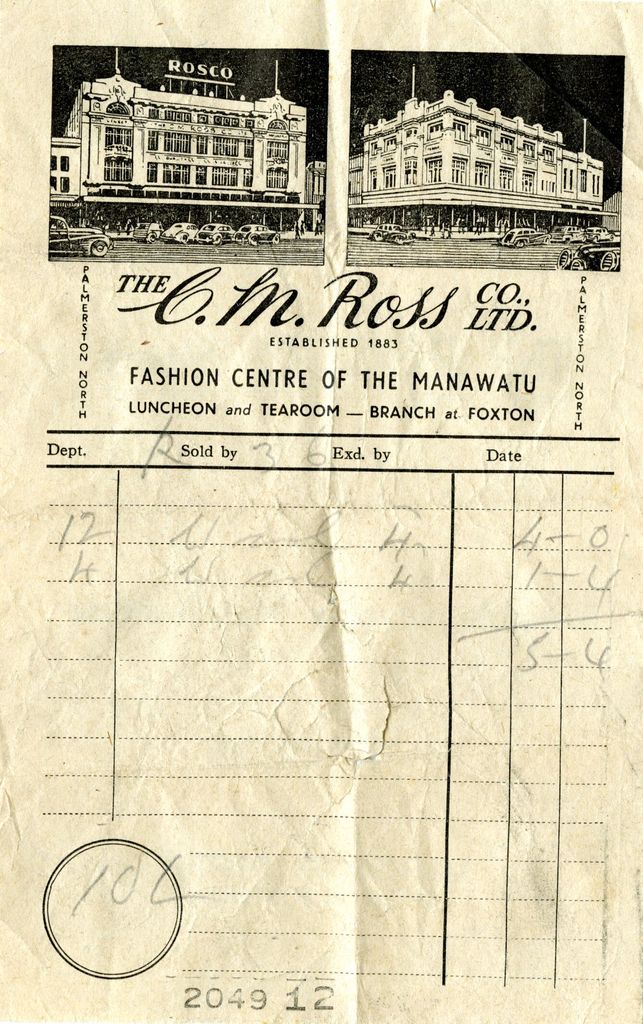 Receipt used by C M Ross Co. Ltd, with letterhead. C M Ross Co. Ltd was one of the foremost department stores of Palmerston North and operated in The Square from 1883 until it was sold to Milne and Choyce in 1959.