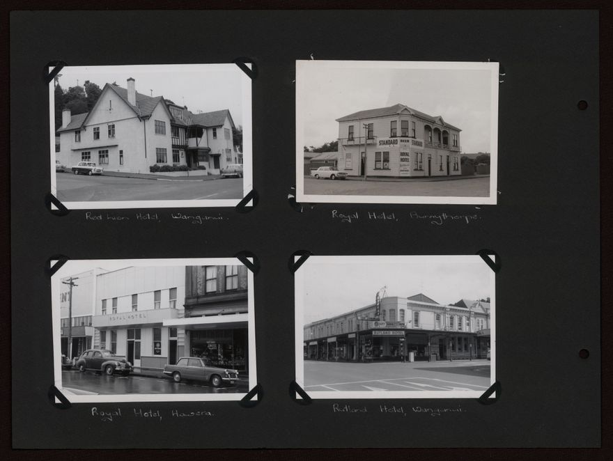 - This album documents hotel buildings in the lower North Island (excluding the Wellington region), listing them alphabetically by the name of the business. - The hotels shown include the: Albion Hotel, Patea; Albion Hotel, Shannon; Albion Hotel, Whanganui; Alton Hotel, Alton; Apiti Hotel, Apiti; Aramoho Hotel, Whanganui; Argyle Hotel, Hunterville; Avoca Hotel, Upokongaro; Ben Nevis Hotel, Turakina; Bourke's Hotel, Kakaramea; Bridge Hotel, Whangaehu; Butler's Reef Hotel, Ōakura; Castlecliff Hotel, Whanganui; Carlton Hotel, Palmerston North; Central Hotel, Hawera; Central Hotel, Napier; Central Hotel, Patea; Central Hotel, Woodville; Clarendon Hotel, Waverley; Club Hotel, Clive; Club Hotel, Marton; Club Hotel, Ōpunake; Club Hotel, Pahiatua; Club Hotel, Palmerston North; Commercial Hotel, Ashhurst; Commercial Hotel, Hawera; Commercial Hotel, Kimbolton; Commercial Hotel, Manaia; Commercial Hotel, Normanby; Commercial Hotel, Stratford; Commercial Hotel, Whanganui; Coronation Hotel, Eltham; Denbigh Hotel, Feilding; Dominion Hotel, Feilding; Egmont Hotel, Hawera; Eltham Hotel, Eltham; Empire Hotel, Feilding; Empire Hotel, Palmerson North; Empire Hotel, Stratford; Federal Hotel, Whanganui; Feilding Hotel, Feilding; Fitzroy Hotel, New Plymouth; Fordell Hotel, Fordell; Grand Hotel, Hastings; Grand Hotel, Palmerston North; Grand Hotel, Whanganui; Gretna Hotel, Taihape; Halcombe Hotel, Halcombe; Hastings Hotel, Hastings; Imperial Hotel, New Plymouth; Imperial Hotel, Palmerston North; Imperial Hotel, Whanganui; Junction Hotel, Norsewood; Junction Hotel, Sanson; Kai Iwi Hotel, Kai Iwi; Mangholm Hotel, Mangaweka; Manawatū Hotel, Foxton; Manutahi Hotel, Manutahi; Masonic Hotel, Ashhurst; Masonic Hotel, Napier; Masonic Hotel, Patea; Masonic Hotel, Waitara; Masonic Hotel, Whanganui; Masonic Hotel, Woodville; Merrylees Hotel, Dannevirke; Midland Hotel, Palmerston North; Mt View Hotel, National Park; Napier Hotel, Napier; Oasis Hotel, Waiouru; Ohakune Hotel, Ohakune; Okiawa Hotel, Okaiwa; Pacific Hotel, Hastings; Post Office Hotel, Pahiatua; Post Office Hotel, Woodville; Provincial Hotel, Napier; Provincial Hotel, Whanganui; Raetihi Hotel, Raetihi; Railway Hotel, Hawera; Railway Hotel, Hunterville; Railway Hotel, Inglewood; Railway Hotel, Marton; Railway Hotel, Palmerston North; Railway Hotel, Woodville; Rangitikei Hotel, Bulls; Red Lion Hotel, Whanganui; Royal Hotel, Bunnythorpe; Royal Hotel, Hawera; Rutland Hotel, Whanganui; State Hotel, New Plymouth; Station Hotel, Whanganui; Taradale Hotel, Taradale; Terminus Hotel, Napier; Waimate Hotel, Manaia; Waitara Hotel, Waitara; Waitōtara Hotel, Waitōtara; Waverley Hotel, Waverley; White Hart Hotel, Hawera; White Hart Hotel, Marton; White Hart Hotel, New Plymouth; Whyte's Hotel, Foxton.