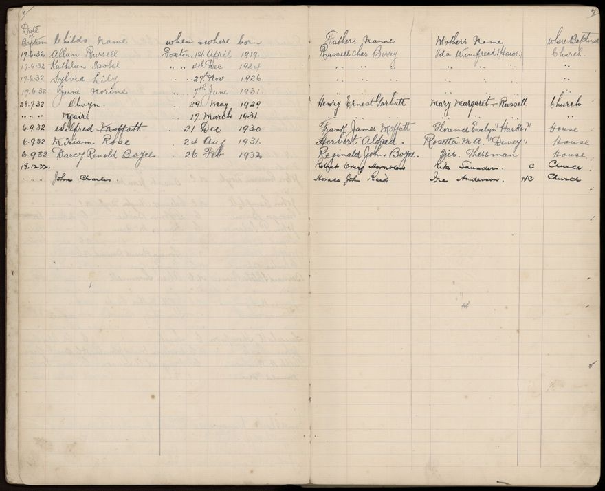 This baptismal register was for the Foxton Presbyterian Church. The register also includes Communion Rolls of Foxton 1907-15, Oroua Bridge 1909-15, Glen Oroua 1909-15, Tiakitahuna 1909-13, and Session Minutes 1909-1928.