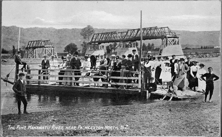 This punt was in operation from 1895 until 1909. It was the second punt to operate on the Manawatu River at Ashhurst, the first being in use from 1871 until the construction of the first bridge in 1886. The bridge (in the background) was damaged in the great Easter flood of 1895 and a new bridge was not constructed until 1909.